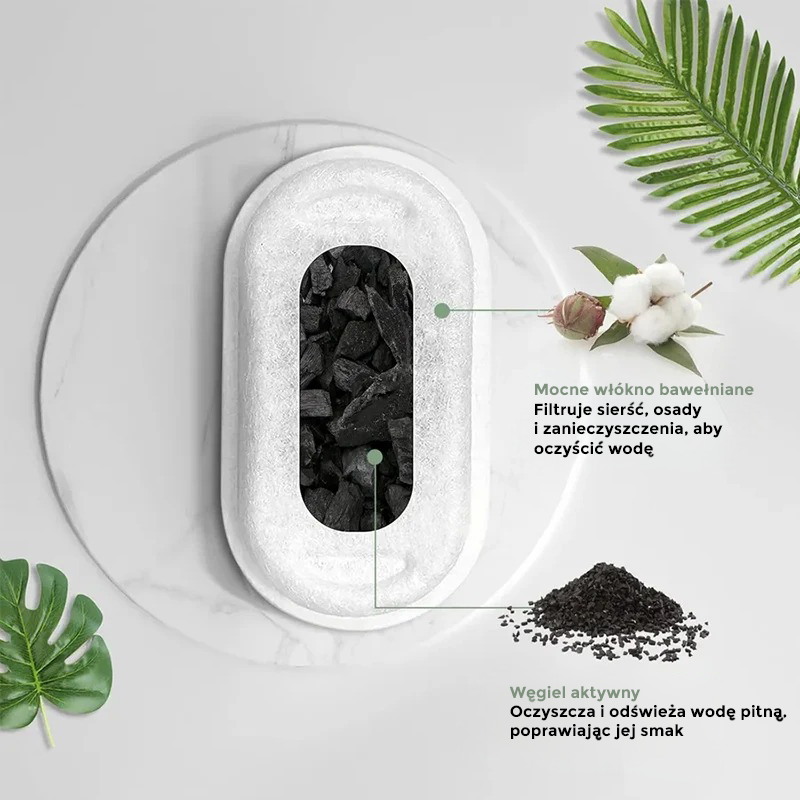 Eliminacja zapachów i smaku – usuwa chlor, osady i związki chemiczne, które mogą sprawiać, że woda pachnie lub smakuje nieprzyjemnie. Koty są bardzo wybredne – czysta, neutralna woda zachęca je do picia.